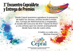 Desde Cepral queremos agradecer la presencia de todos los vecinos, a los artistas, locales e invitados, a nuestro Consejo de Administración y a los medios de comunicación locales que nos ayudaron en la difusión y a los de Capilla del Señor que cubrieron el 3° Encuentro CepralArte, como así también a los representantes del Pequeño Hogar Exaltación.